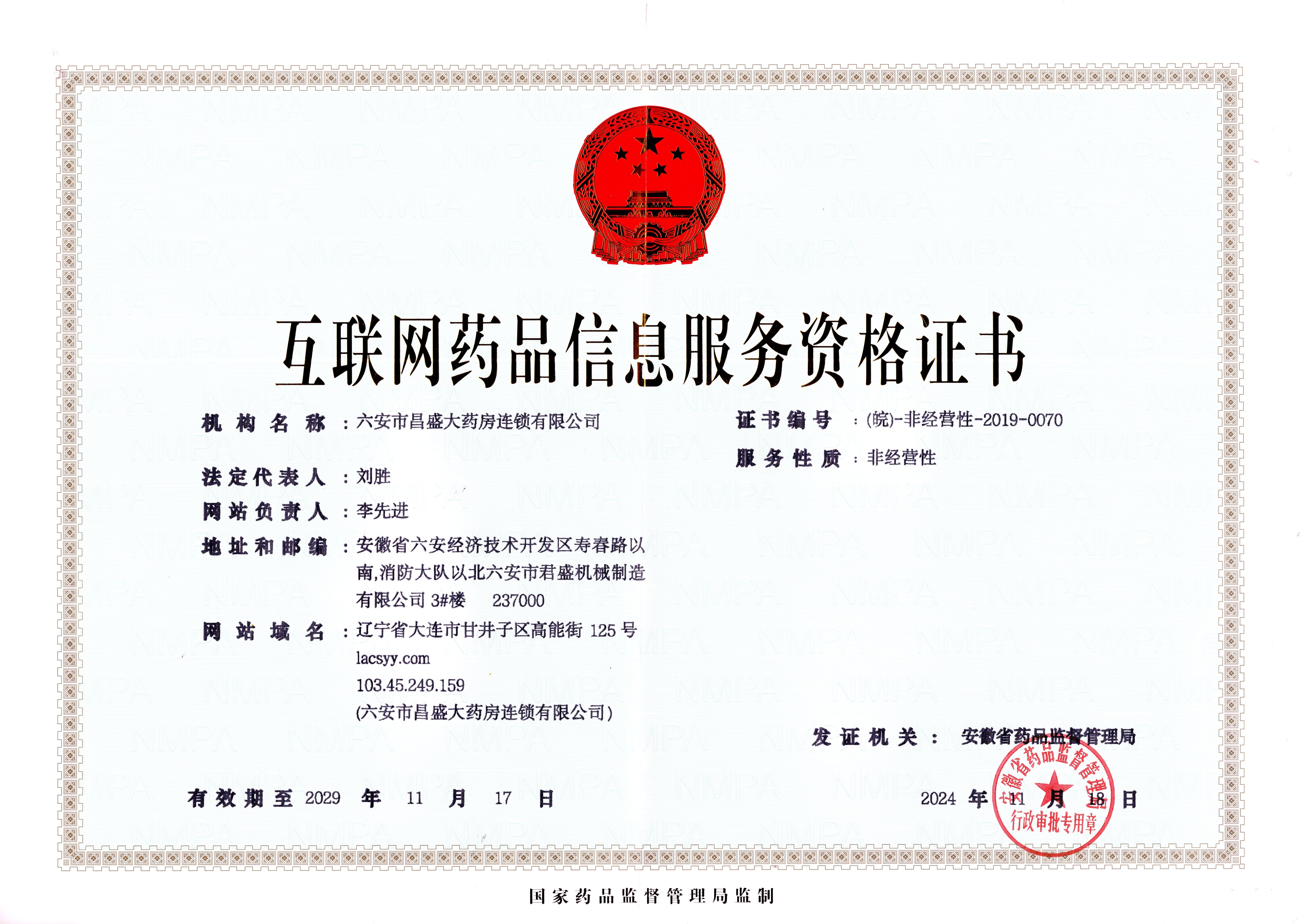 六安市昌盛大藥房連鎖有限公司 互聯(lián)網(wǎng)藥品資格證書(shū)編號(hào):(皖)-非經(jīng)營(yíng)性-2019-0070